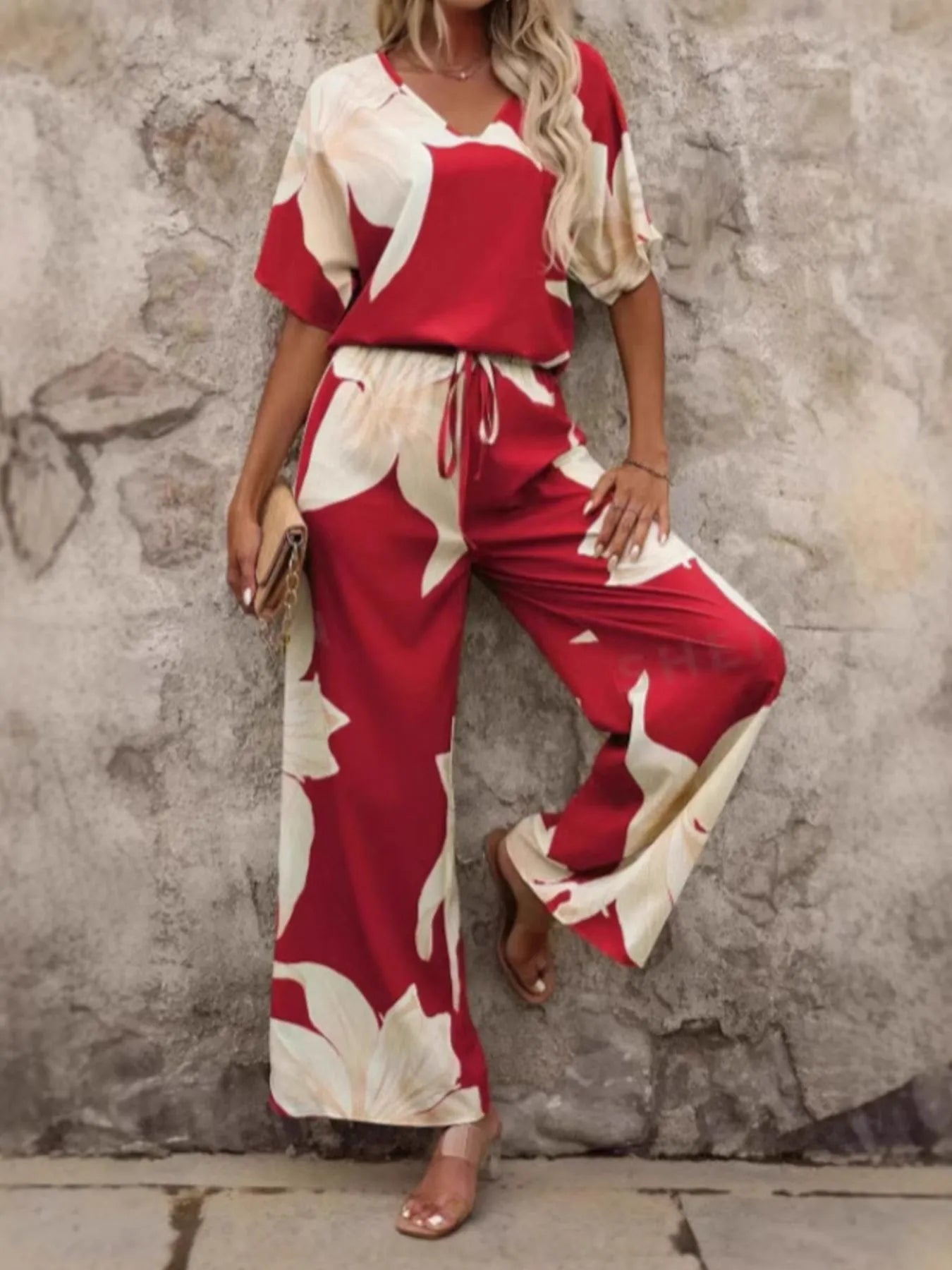 Printed V-Neck Top and Pants Set